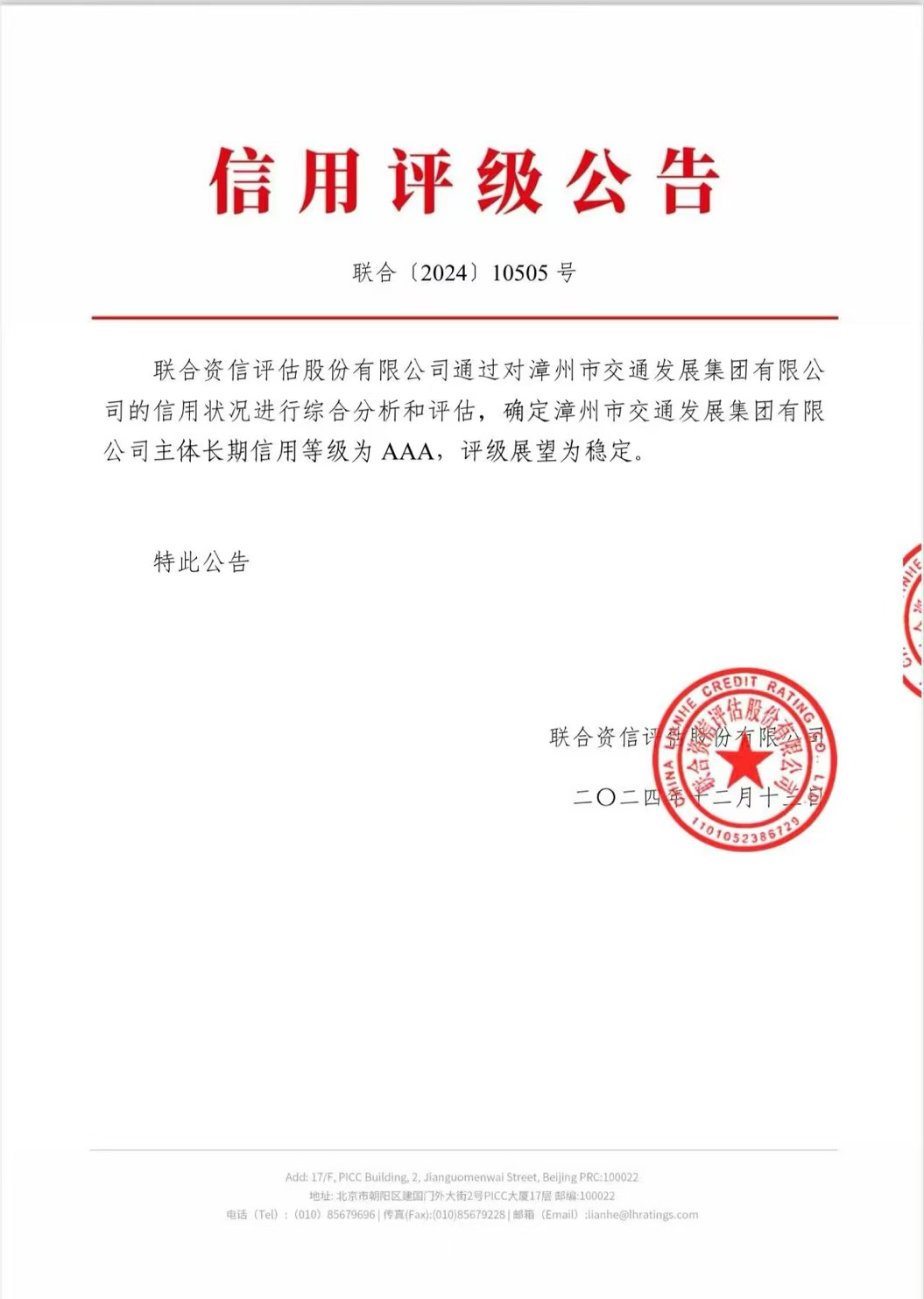 聯(lián)合資信是國內(nèi)最專業(yè)、最有影響力、最具權(quán)威的信用評級機(jī)構(gòu)之一。聯(lián)合資信授予漳州交通集團(tuán)AAA信用等級的認(rèn)證,充分體現(xiàn)了國內(nèi)信用領(lǐng)域?qū)φ闹菔薪煌òl(fā)展集團(tuán)有限公司綜合實(shí)力、信用水平、運(yùn)營能力、轉(zhuǎn)型升級和發(fā)展前景等方面的高度認(rèn)可。